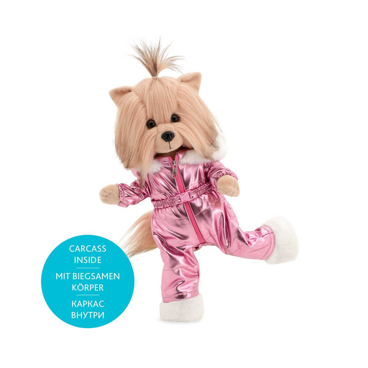 Tento zimní set oblečení pro plyšového pejska se skládá ze stylové metalické zimní kombinézy s kapucí a botiček.
