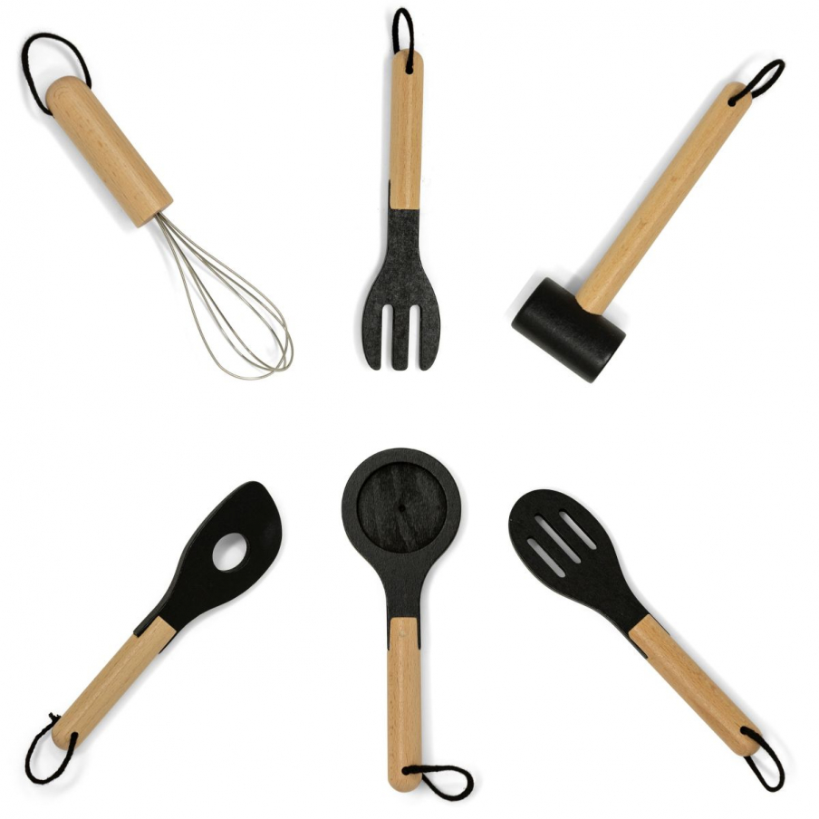 Dětská dřevěná metlička na dresing, palička na maso, vařečky i velká vidlice. To je tato krásná sada kuchyňského náčiní pro malé kuchařky a kuchaře, kteří rádi napodobují své rodiče v kuchyni. Díky této realistické sadě vařeček už vám děti nebudou vybírat z kuchyně ty vaše.
