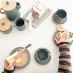 Dřevěná sada nádobí potěší všechny rodiče, kteří upřednostňují minimalismus u hraček a tlumené barvy. Díky této kombinaci budou i hračky nenápadné v jakémkoli interiéru.