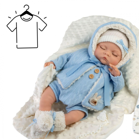 Součástí balení je i oblečení pro miminko a doplňky. (heboučká deka, dudlík s klipem, plenka pro miminko a kousátko)