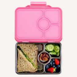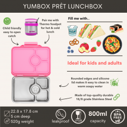 Yumbox Prét Bento je nerezová varianta svačinového boxu. Se svým objemem 800 ml dovoluje připravit poměrně veliké porce jídla. Vhodný je box pro děti 1. stupně základní školy, teenagery, ale i dospělé.