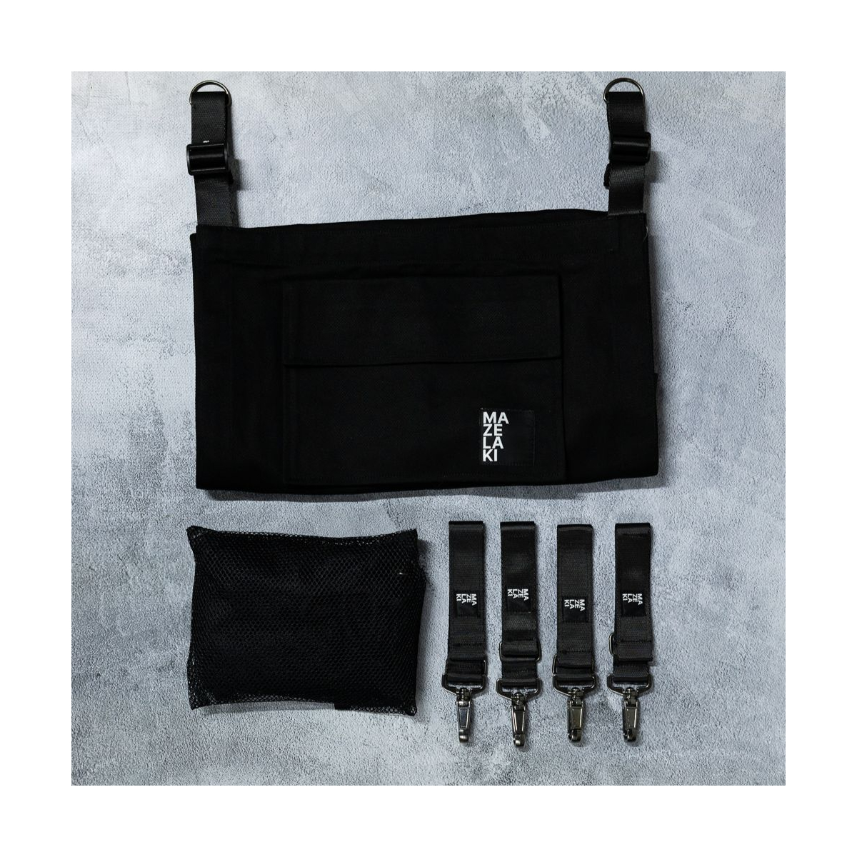 Sada obsahuje: Houpací síť na kočárek Mazelaki, bezpečnostní síť, 4 karabiny pro upevnění na rám kočárku, návod k použití.