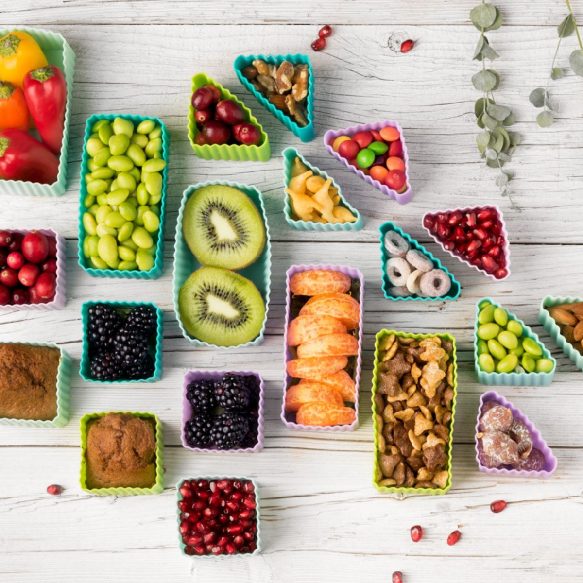 Tyto silikonové misky jsou nejen funkční – elegantně oddělí ovoce, zeleninu, dip i krekry –, ale zároveň podporují kreativní balení svačiny.